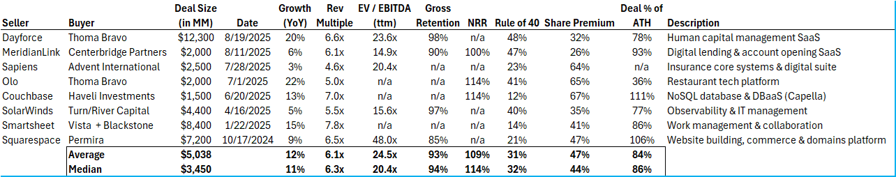 Across eight recent/public SaaS take-privates (Dayforce, Olo, Smartsheet, Squarespace, SolarWinds, Couchbase, Sapiens, MeridianLink), the pattern is clear: PE is capitalizing on the current unsexy sentiment and thus value-pricing for vertical SaaS, despite sound fundamentals: